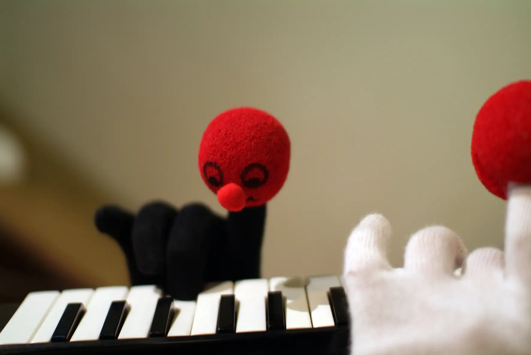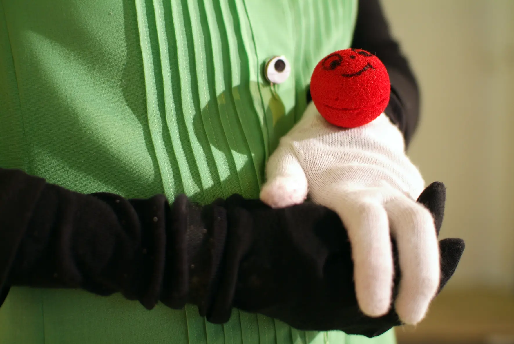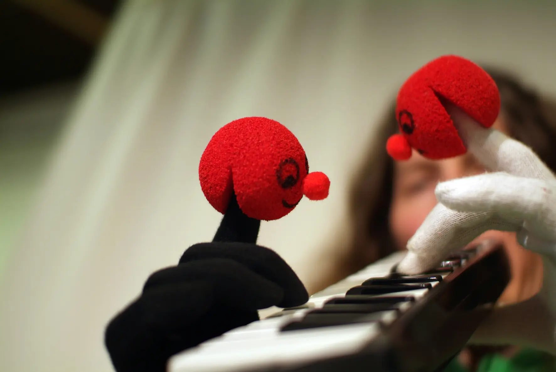 Die Geschichte über das kleine Rotbällchen lebt vom ständigen Wandel. Sie entführt uns in eine phantasievolle Welt, in der eins ins andere übergeht, seine Gestalt verändert und uns darüber staunen lässt. Ein kleiner roter Ball bekommt ein Gesicht und blickt uns freundlich an – Rotbällchen. Eine Hand wird zu Rotbällchens kleinem Körper, mit dessen Beinchen es schwarz- weißen Zehen Töne entlockt. Ein riesiger roter Ballon mit dem es eben noch durch den Raum schwebte, verliert seine Luft und zieht als Fisch an uns vorüber. Er hinterlässt uns kleine rote Bällchen…